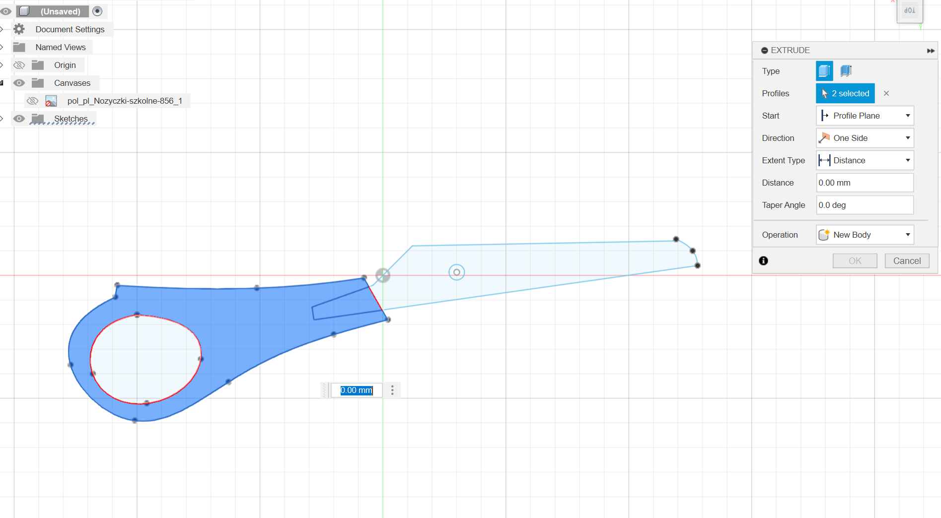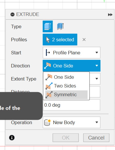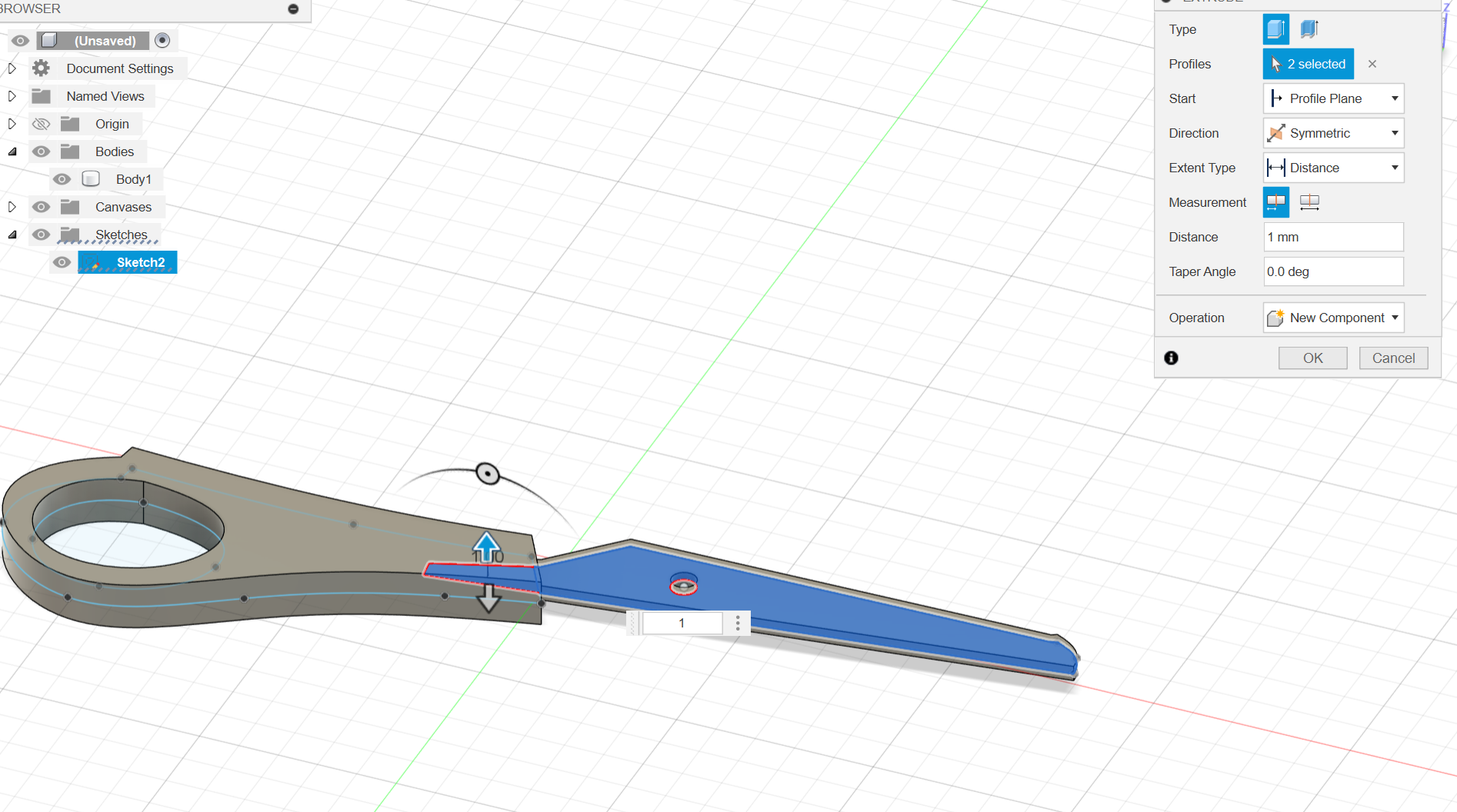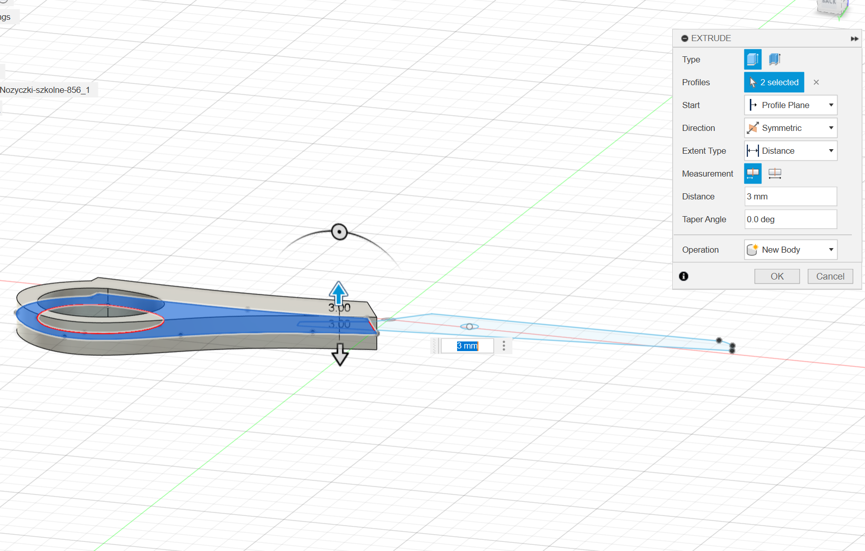 Mając już szkic składający się z 5 profili możemy przejść do wyciągania, pierwszym elementem jest wyciągniecie rączki, w opcji extrude wybieramy dwa profile a w okienku po prawej stronie w opcji "direction" wybieramy "symetric" i wyciągamy na 3 mm