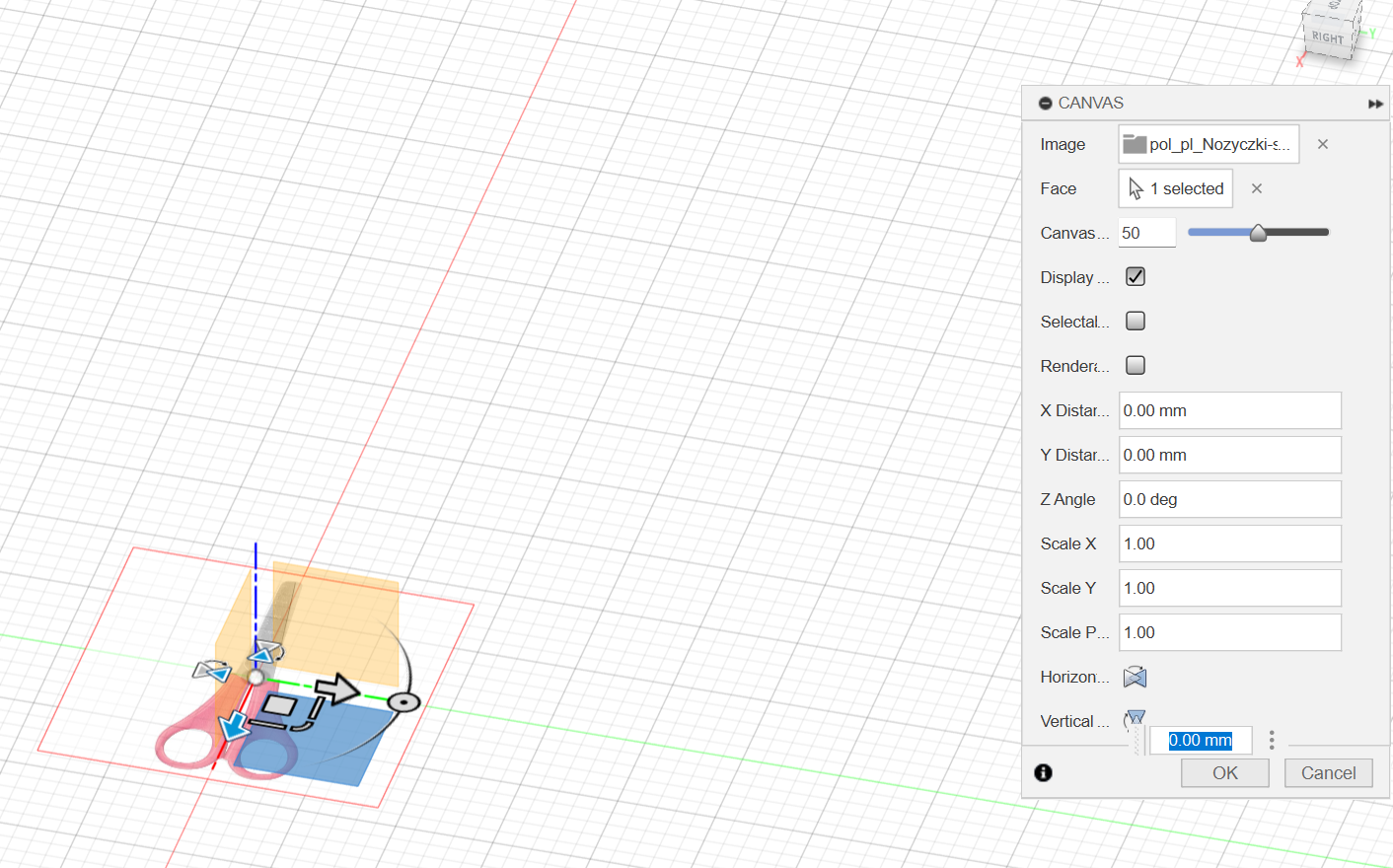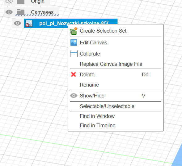 Następnym krokiem jest skalibrowanie naszego rysunku, w tym celu wyszukujemy na drzewku po lewej stronie canvases, rozwijamy i szukamy naszego obrazka. Po znalezieniu klikamy na niego prawym przyciskiem myszy i wybieramy opcję "calibrate". Teraz musimy wskazać dwa punkty i podać odległość między nimi (dlatego te nożyczki są dobre na początek bo mają na ostrzu linijkę dzięki której możemy łatwo skalibrować nasz obraz)