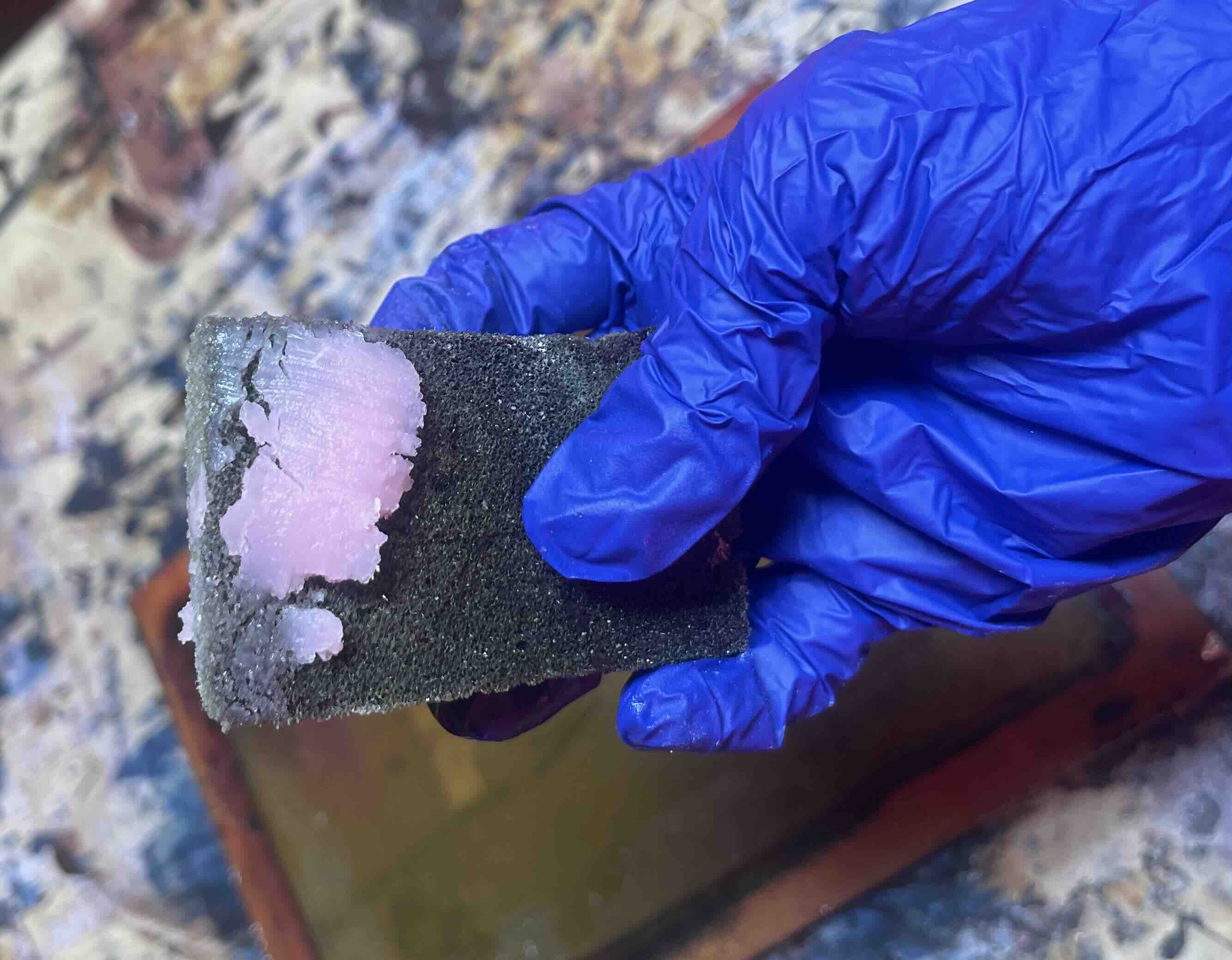 - Weź z półki pastę do czyszczenia Pregasol. W miarę możliwości ekonomicznie nałóż za pomocą gąbki lub szpatułki pastę na obie strony sita. Pozostaw na ok. 5 minut, żeby preparat zaczął działać.
