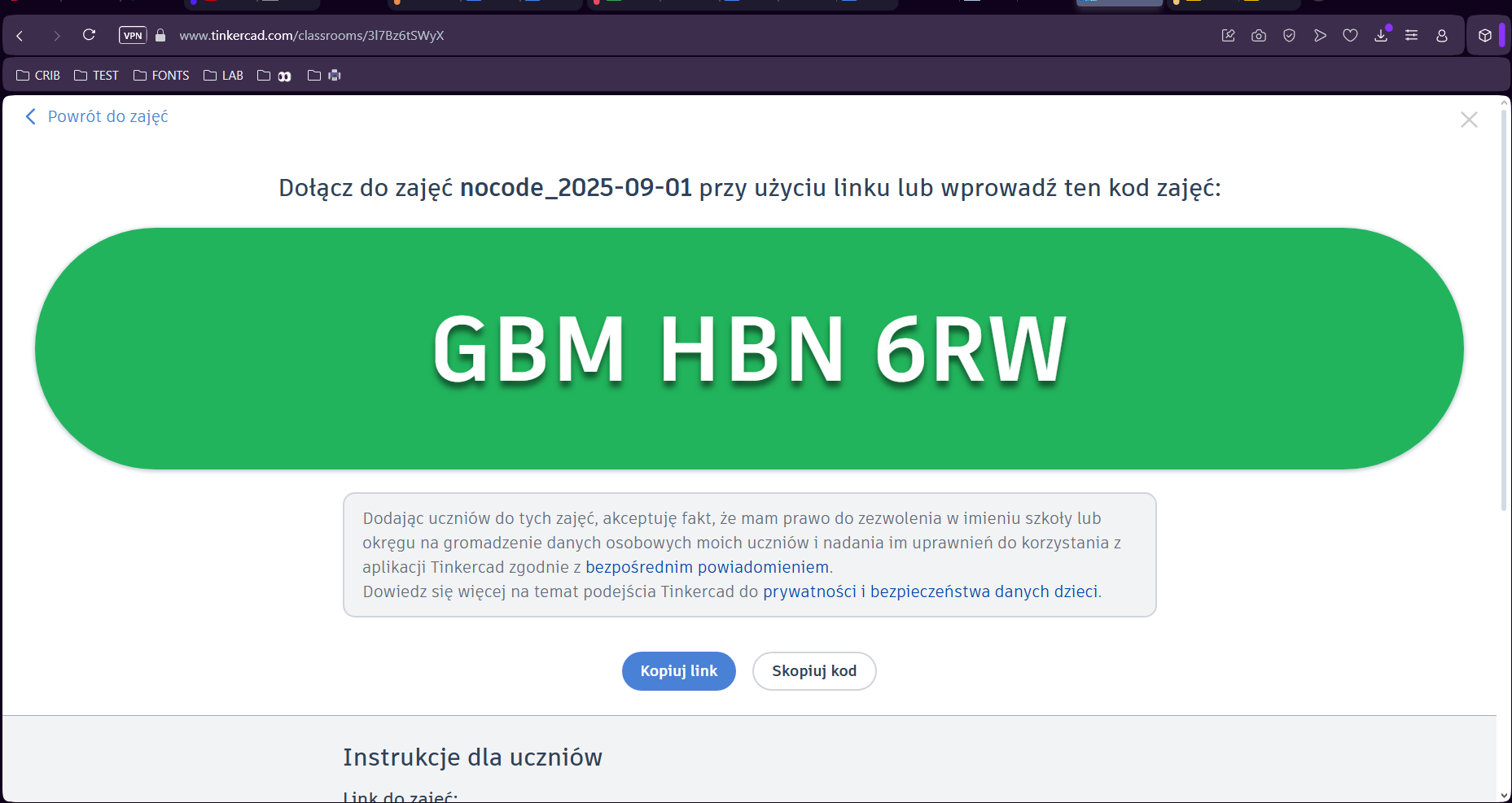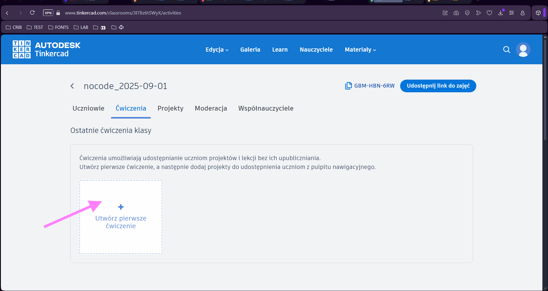 9. Po kliknięciu w nazwę stworzonych zajęć pojawi się taki widok. Kliknij "Udostępnij link do zajęć", aby osoby biorące udział w warsztacie mogły do nich dołączyć.