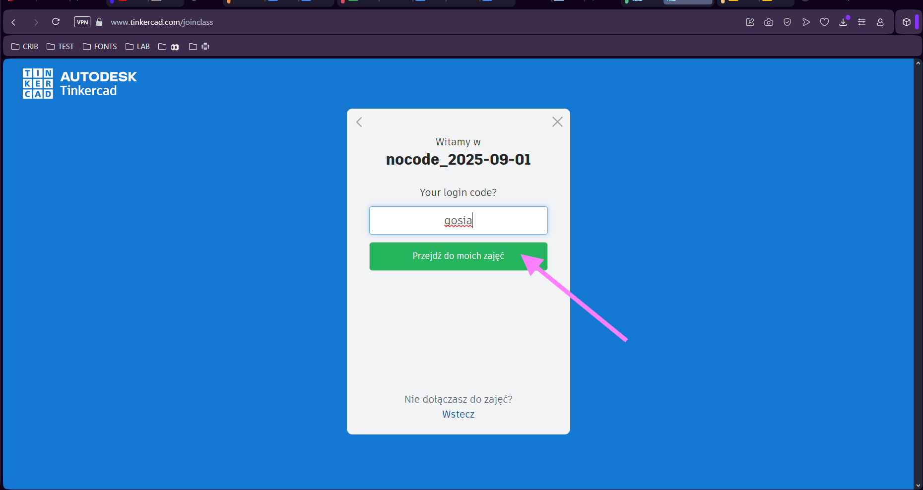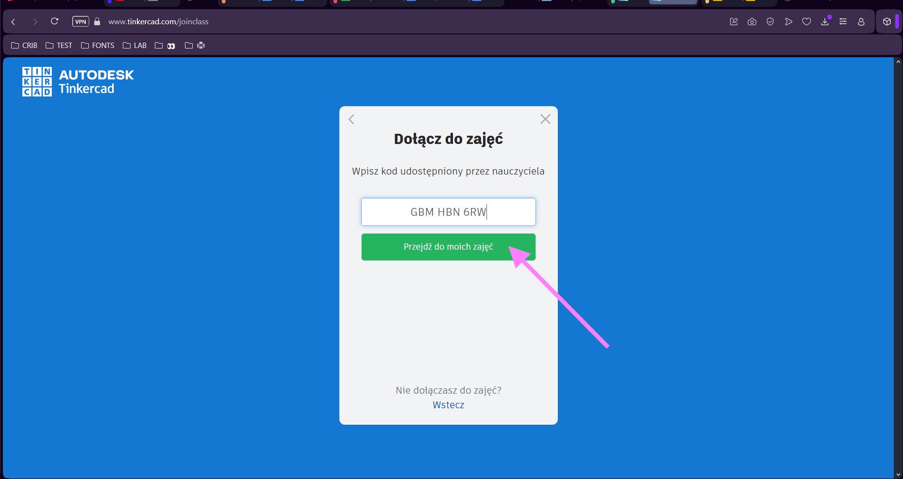 13. Każda z osób biorących udział w warsztatach wpisuje ten sam kod do zajęć – nie trzeba uwzględniać spacji ani drukowanych liter. Po wpisani kodu klikają "Dołącz do moich zajęć".