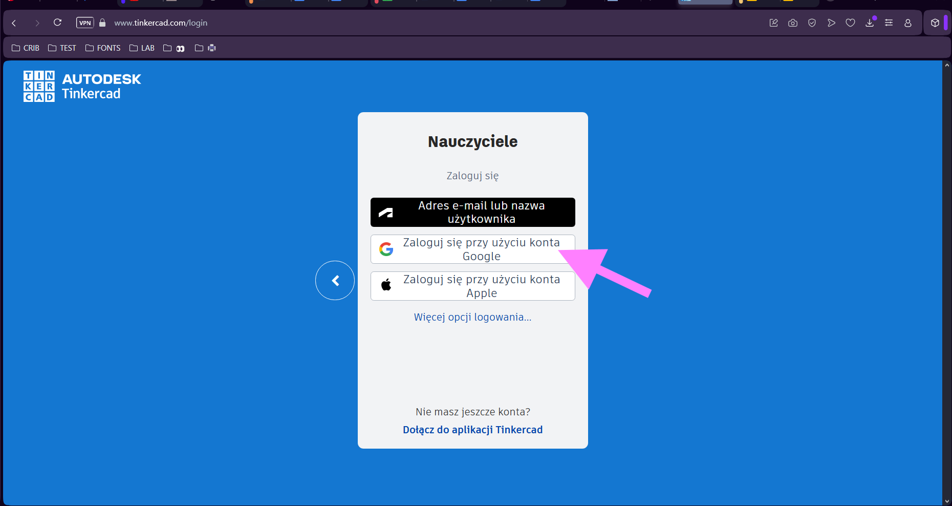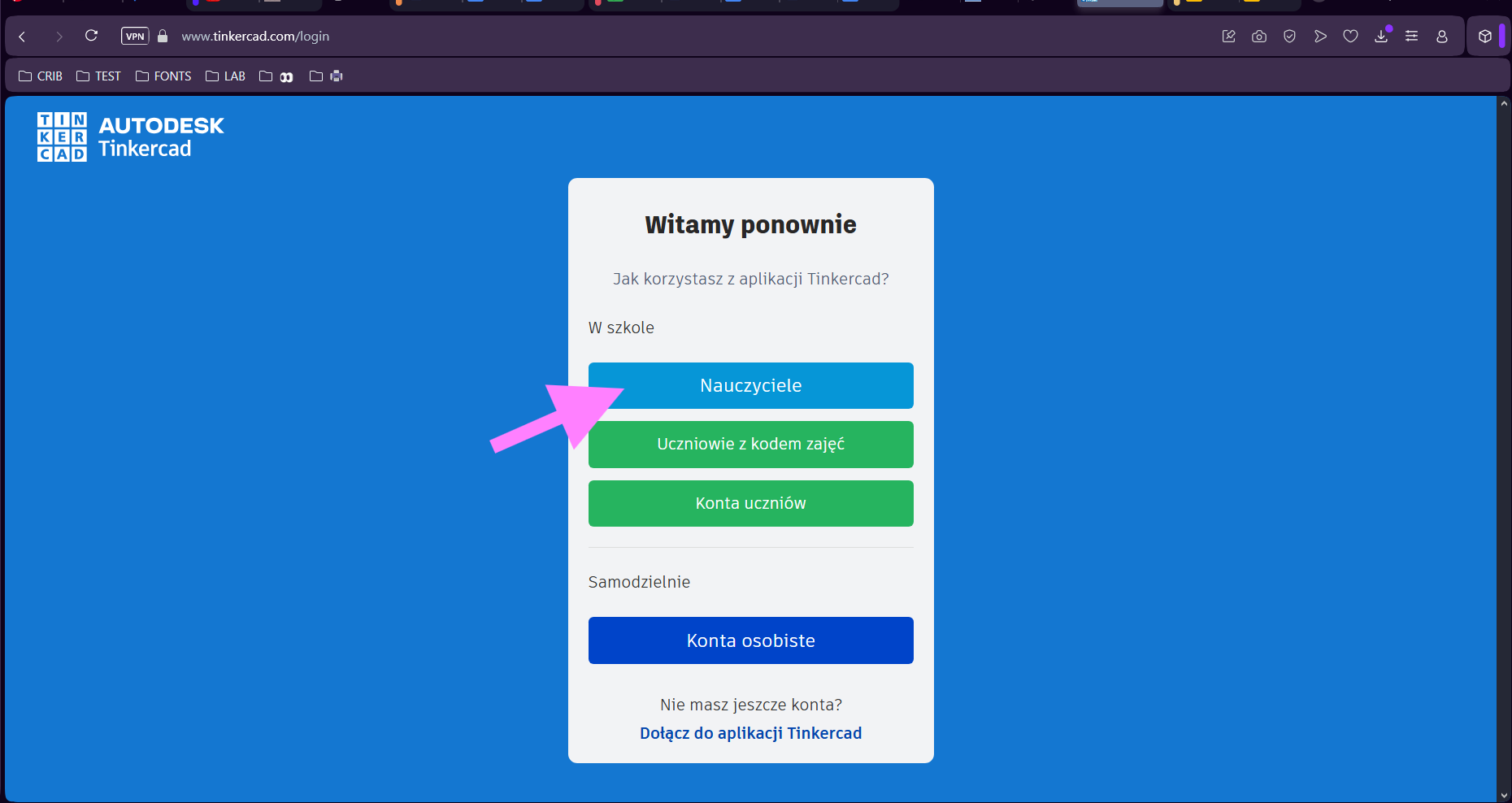 1. Otwórz dowolną przeglądarkę internetową i wejdź na stronę tinkercad.com. W prawym górnym rogu kliknij ikonę Zaloguj się lub Zarejestruj się – w zależności od tego, czy masz już konto.