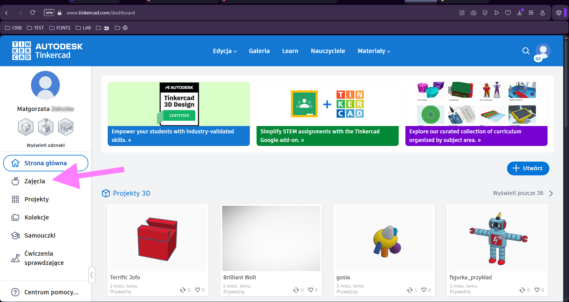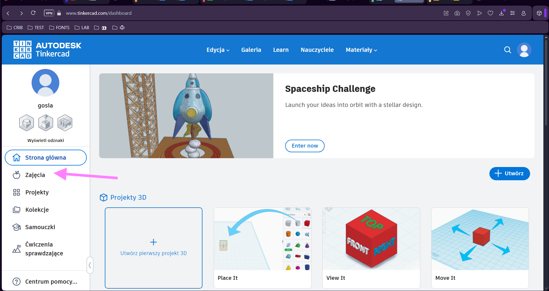22. Każda z osób biorących udział w warsztatach klika "Zajęcia" po lewej stronie.