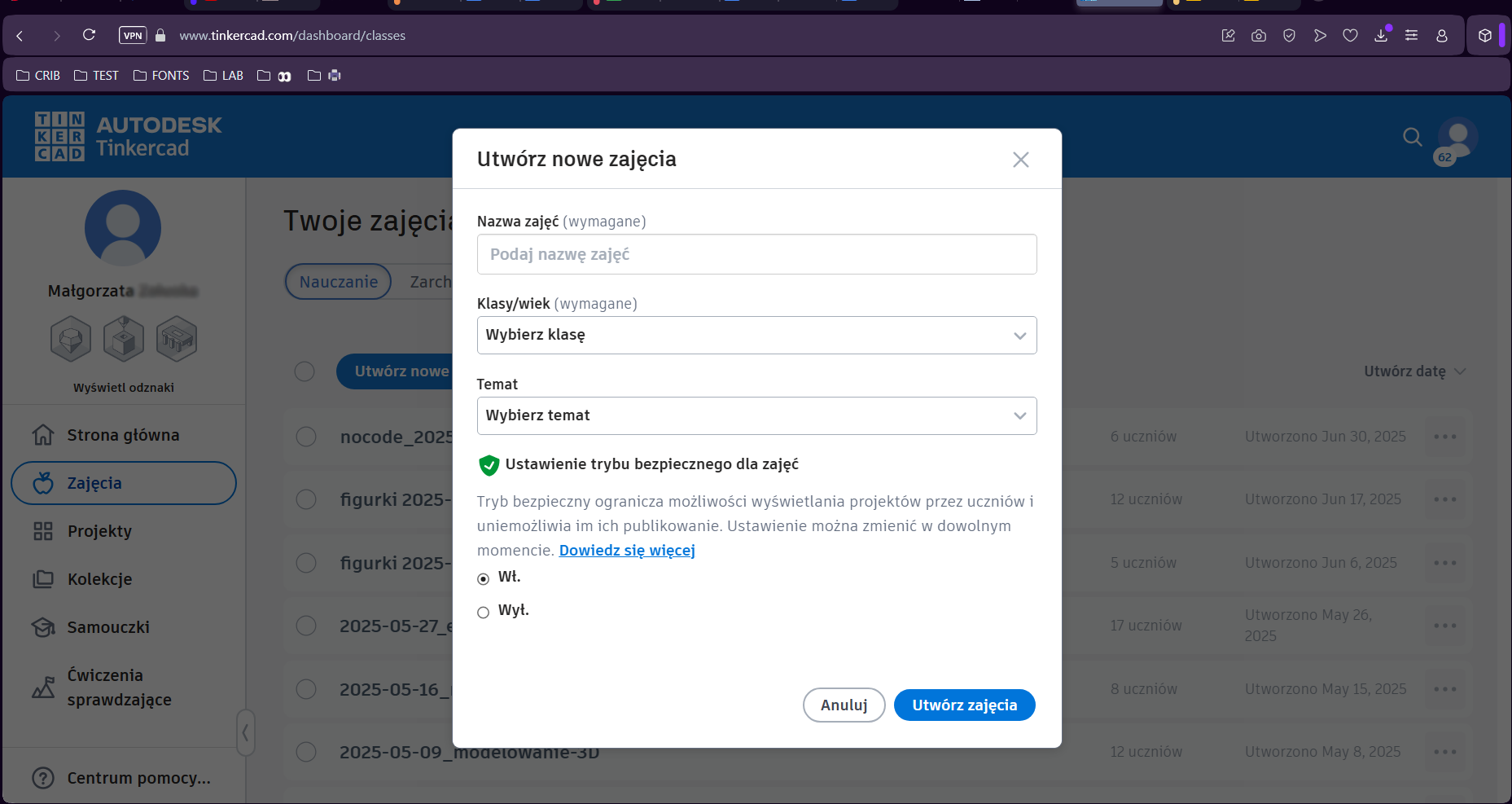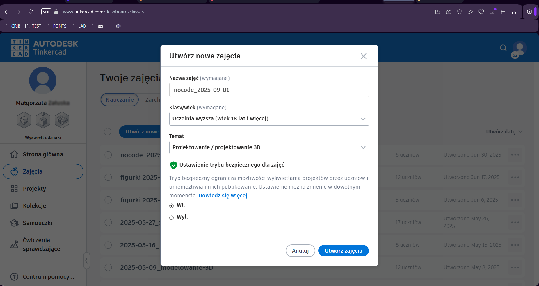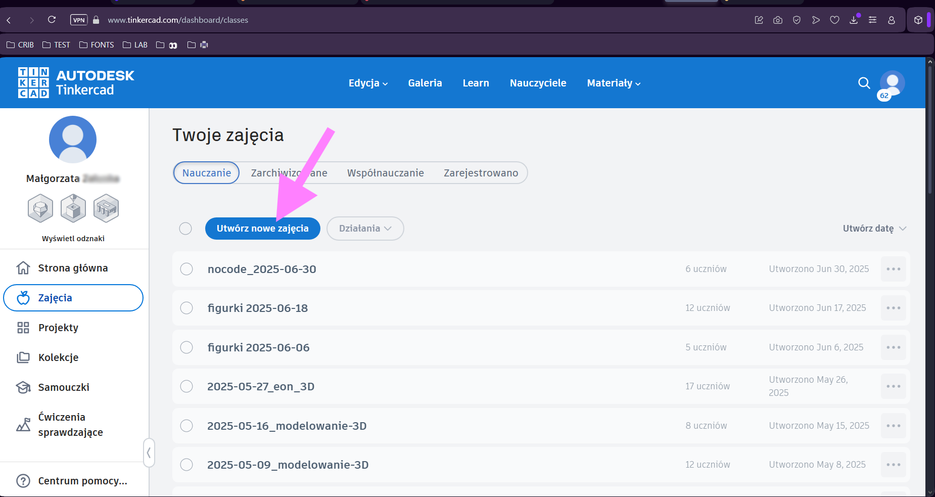 6. W sekcji "Zajęcia" widać wszystkie stworzone przez Ciebie zajęcia/klasy. Warto dodawać do nich datę, tak żeby nie pogubić się w przyszłości kiedy zajęć będzie więcej. Kliknij "Utwórz nowe zajęcia".