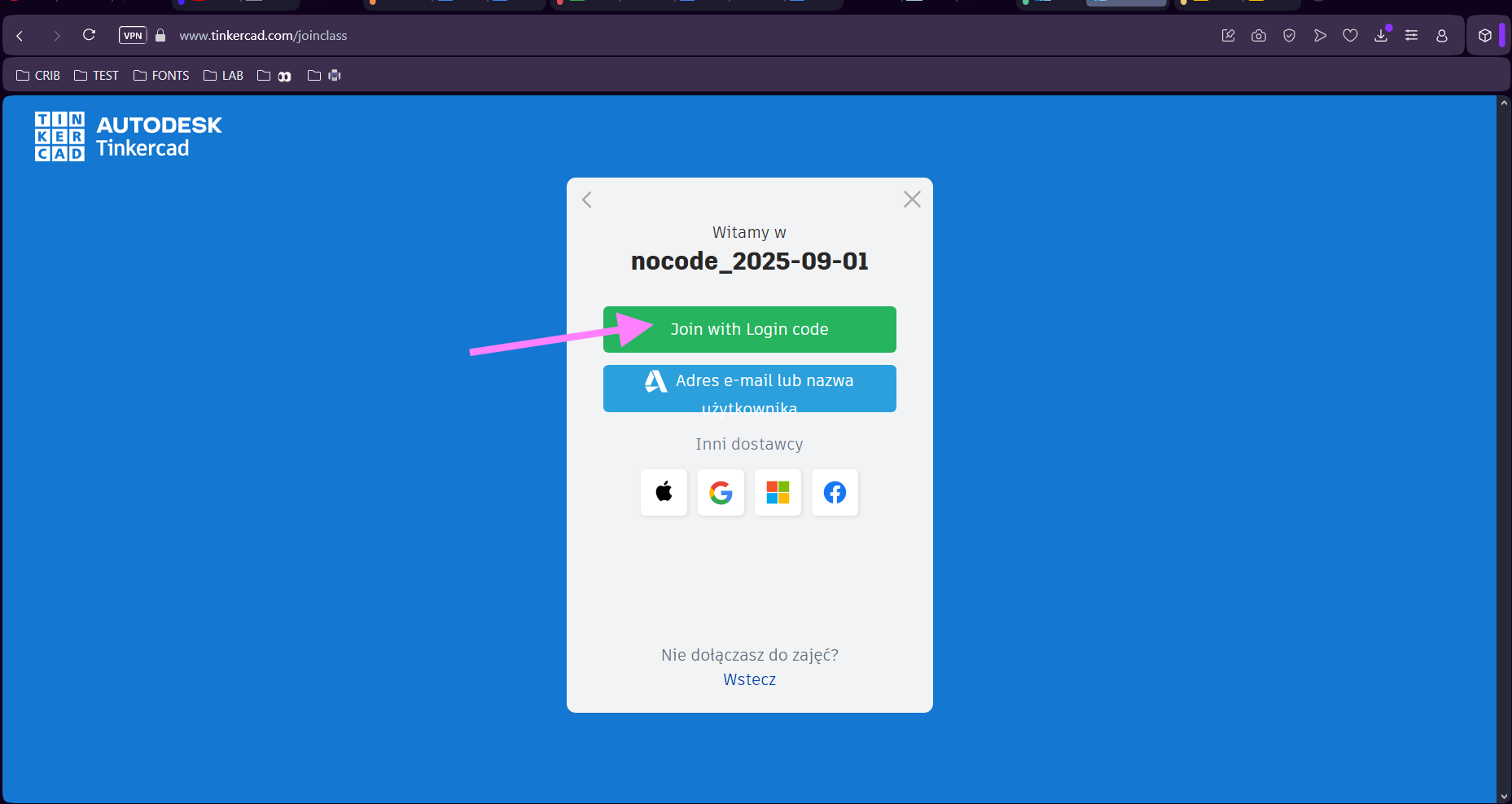 11. Osoby biorące udział w warsztatach wykonują ten sam krok, co Ty - osoba prowadząca – w punkcie 1. Zamiast klikać "Zaloguj się", muszą zjechać na dół strony.